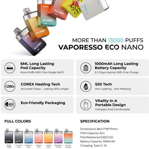 Το Vaporesso Eco Nano είναι μια συσκευή με μικρές διαστάσεις αλλά αρκετά ισχυρό. Τροφοδοτείται από μία ενσωματωμένη μπαταρία 1000mAh με μέγιστη ισχύ εξόδου 16W και είναι επαναφορτιζόμενη μέσω θύρας φόρτισης USB τύπου C.