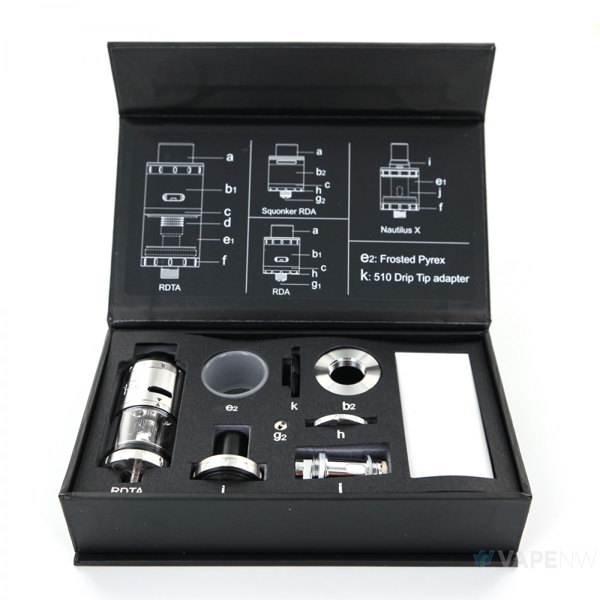 1* 510 Drip Tip Adapter / 1* Capillary Screw / 1* Top Hardware with Top Airflow / 1* RDA Base